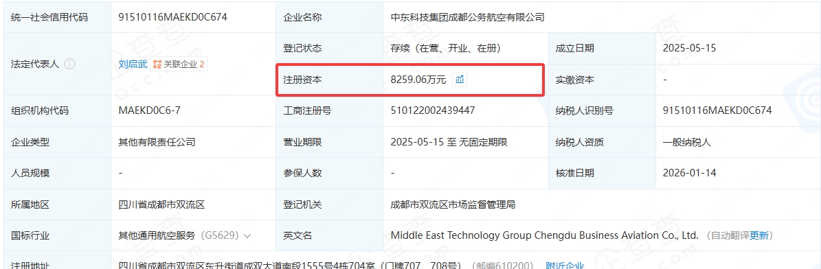 企查查显示,中东科技集团成都公务航空有限公司成立于四川省成都市,法定代表人为刘启武,注册资本为8259.06万元。值得一提的是,全国从事航空运输业的企业约为三万家,而该企业注册资本超过全国96%的同行。