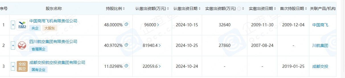 公开信息显示,成都航空有限公司作为首家国产C909飞机运营商。近日,其发生工商变更,注册资本由6.8亿元增至20亿元,增幅高达194%。此次13.2亿元的增资由中国商用飞机有限责任公司、四川航空集团有限责任公司、成都交投航空投资集团有限公司三家股东共同完成。增资后,上述三家公司的持股比例分别为48%、40.9702%、11.0298%。