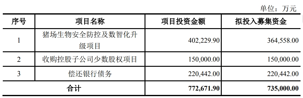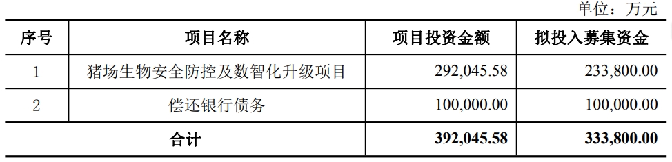 公告显示,本次定增募集资金中,23.38亿元拟投入“猪场生物安全防控及数智化升级项目”,占总募资额的70.04%。该项目总投资额约29.20亿元,旨在对公司现有猪场在生物防疫设施设备、智能化设备、信息化平台、种猪等方面进行全面更新升级,提高现有猪场的生物防疫水平、环境舒适度、智能化水平、信息化水平和种群质量。