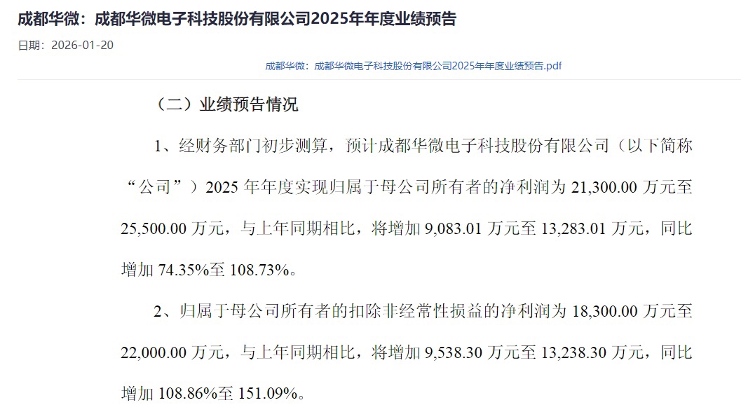 1月19日晚间,成都华微发布业绩预告,公司预计2025年实现归属于上市公司股东的净利润为盈利2.13亿至2.55亿元,同比增长74.35%至108.73%;实现扣非净利润预计为1.83亿元至2.20亿元,同比增幅达108.86%至151.09%。
