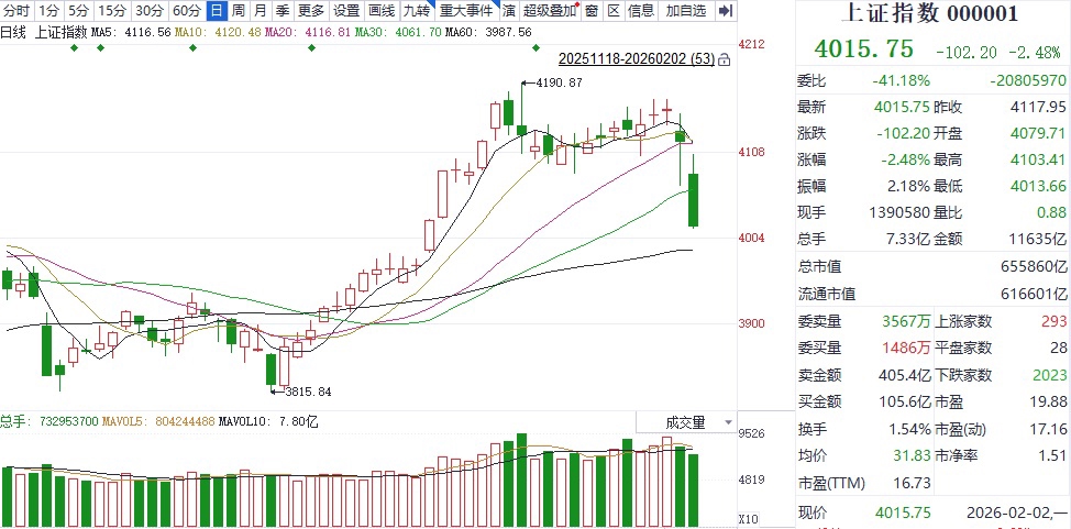 自2025年4月本轮行情启动以来,上证指数周一首次出现百点长阴,单日跌幅达到2.48%,也刷新了反弹以来的单日最大跌幅。分析人士认为,贵金属暴跌、科技股退潮,市场在缺乏主心骨的背景下,多杀多导致A股出现大幅下挫。短期看,市场恐慌情绪还有待释放,投资者应关注下档多个关键点位的支撑。