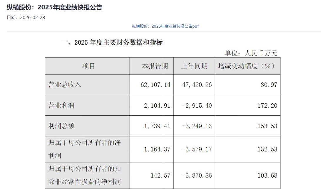 根据纵横股份最新发布的2025年业绩快报显示,公司实现主营业务收入62107.14万元,同比增加30.97%,实现归属于母公司股东的净利润1164.37万元,同比扭亏为盈。公司表示,随着国家及地方低空经济相关规划的密集出台,无人机作为低空经济的核心载体,在智慧政务、巡检、应急救援、物流等领域的商业化应用快速落地。公司作为国内无人机链主领军企业,核心产品与解决方案直接受益于市场需求的规模化放量,尤其是以“无人值守系统+纵横云+AI”形成的低空AI数字化解决方案在国内多地开展应用示范,同时公司积极推进国内外重点项目交付验收,加强成本费用控制,多措并举实现主营业务收入显著增长,净利润扭亏为盈。