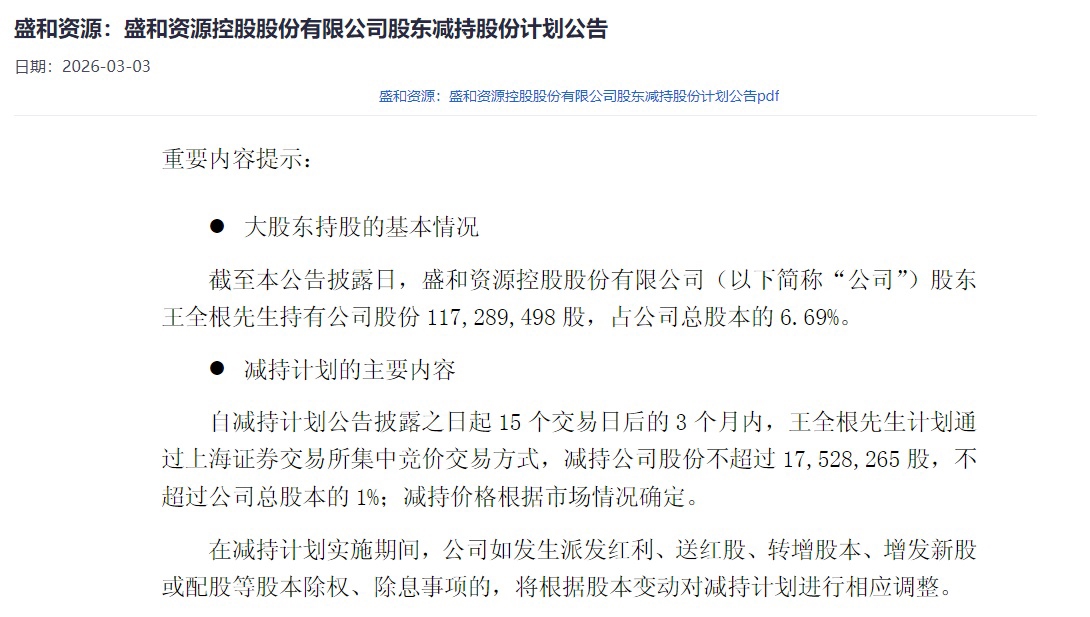 3月2日盘后,盛和资源发布公告称,自减持计划公告披露之日起15个交易日后的3个月内,王全根先生计划通过上海证券交易所集中竞价交易方式,减持公司股份不超过17528265股,不超过公司总股本的1%;减持价格根据市场情况确定。截至本公告披露日,公司股东王全根先生持有公司股份117289498股,占公司总股本的6.69%。