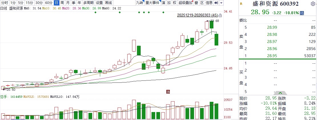 二级市场上,本已处在高位的盛和资源出现滞涨,在减持计划披露后,股价迎来快速杀跌。3月3日,该股明显低开后出现直线回落,股价盘中多次触及跌停。午后开盘不久,跌停板被封死,截至收盘报28.95元。