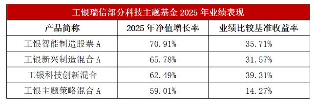根据基金2025年四季报,工银智能制造股票A、工银新兴制造混合A、工银科技创新混合、工银主题策略混合A近一年收益率均超50%,分别为70.91%、65.78%、62.49%、59.01%,表现显著超越各自的业绩比较基准。