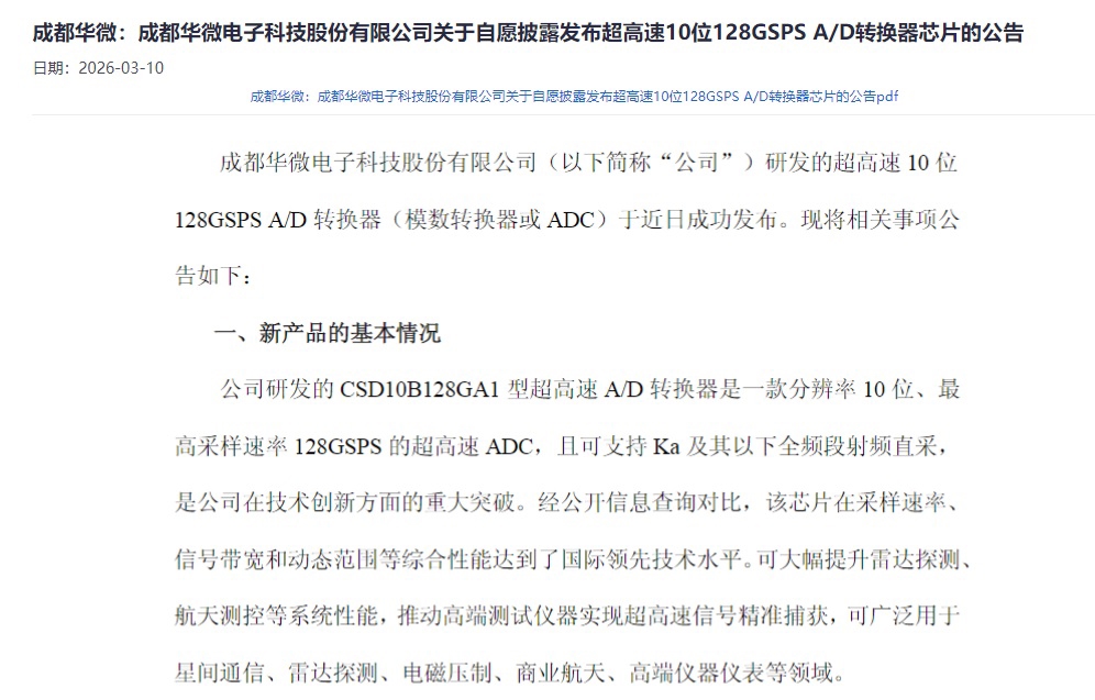 成都华微(688709)3月9日晚间发布《关于自愿披露发布超高速10位128GSPS A/D转换器芯片的公告》,公司研发的超高速10位128GSPSA/D转换器(模数转换器或ADC)于近日成功发布。