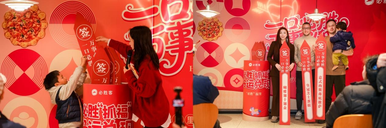 在活动一侧,一个一米高的国潮风“必胜抓运桶”同时成为现场焦点,大家亲手抽取印有产品名称的福签,如超级至尊披萨——新年好运加满。将传统新春“讨彩头”的方式变得可互动、可兑现。来自塞尔维亚的外国友人兴奋地举着自己抽到的福签,用不太流利但充满热情的中文说道:“在中国过年,我感受到了和中国朋友一样的快乐,像我们圣诞节会去抽取幸运礼物一样,不过它更有中国韵味,把开运和美食结合在一起,让我对新年有了新的期待。”