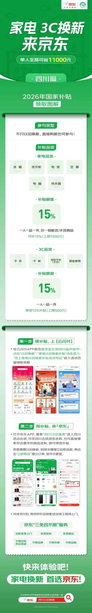 先来看看四川消费者该如何领取与使用国补。消费者在云闪付APP首页修改定位到四川省内城市,点击“以旧换新”“家电以旧换新补贴”,点击进入“线上家电以旧换新补贴活动专区”,进入活动页面领取资格。打开京东APP,搜索“四川以旧换新”进入四川活动会场,随后可在京东的四川活动会场浏览选购,也可直接搜索符合要求的商品选购,收货地址限四川,即可享受补贴。需要注意的是,国补资格领取仅当天有效。用户可选择单独购买产品,也可选择使用以旧换新下单,均可享国补。