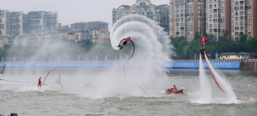紧接着,数名运动员驾驶动力冲浪板如离弦之箭,在南河之上做出交叉、回旋、腾空等高难度动作,引来两岸观众阵阵惊叹,作为今年世运会刚刚新增的比赛项目,今天再次零距离呈现在观众面前。