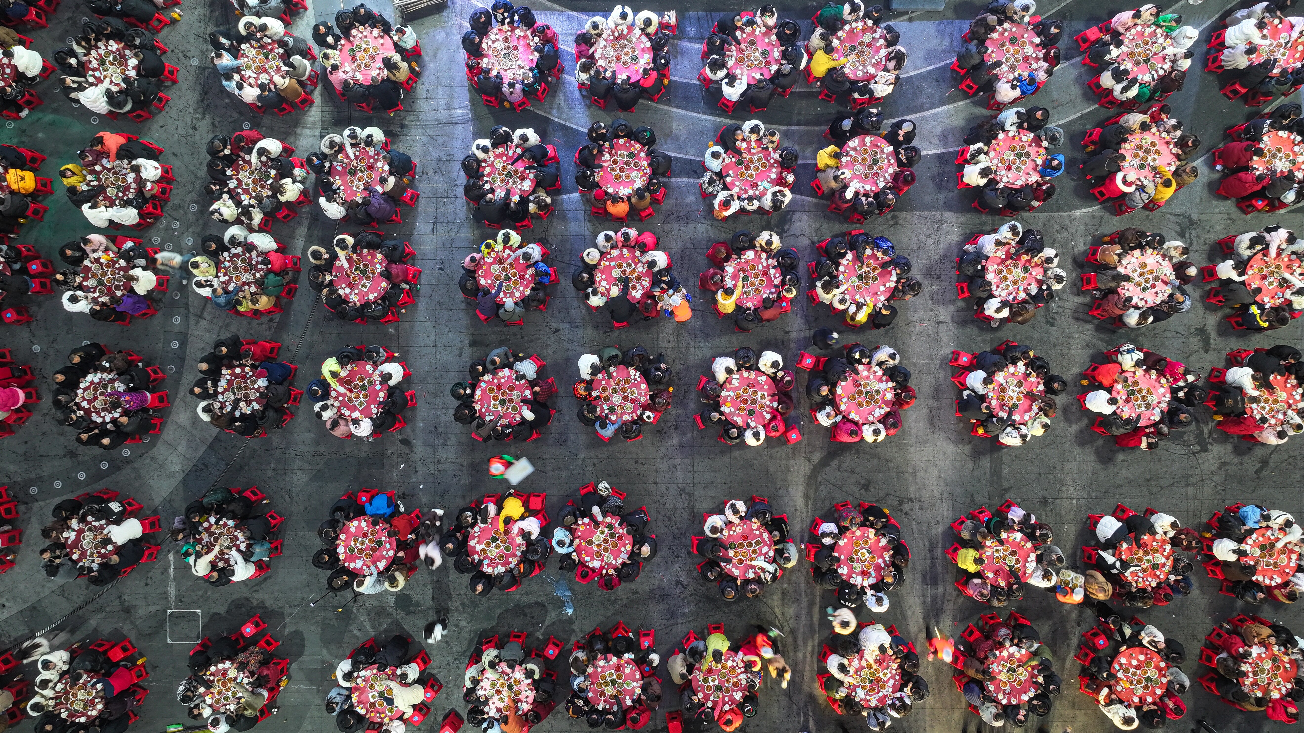 仁寿县怀仁街道栖西里商业街区千人坝坝宴火热开席,市民游客围坐共享佳肴。摄影 潘帅