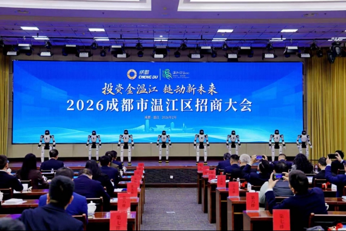 金融投资网讯(记者 黄凌屹)机器人跳起了开场舞,还主持起了招商大会的发布环节……2月27日,在“投资金温江,链动新未来”2026成都市温江区招商大会上,温江本土企业中科源码联合生态企业打造的智能机器人“小温”“小江”亮相主持,与机器人舞蹈队共同演绎科技序曲,瞬间点燃现场气氛,直观展现了温江的科技创新实力。
