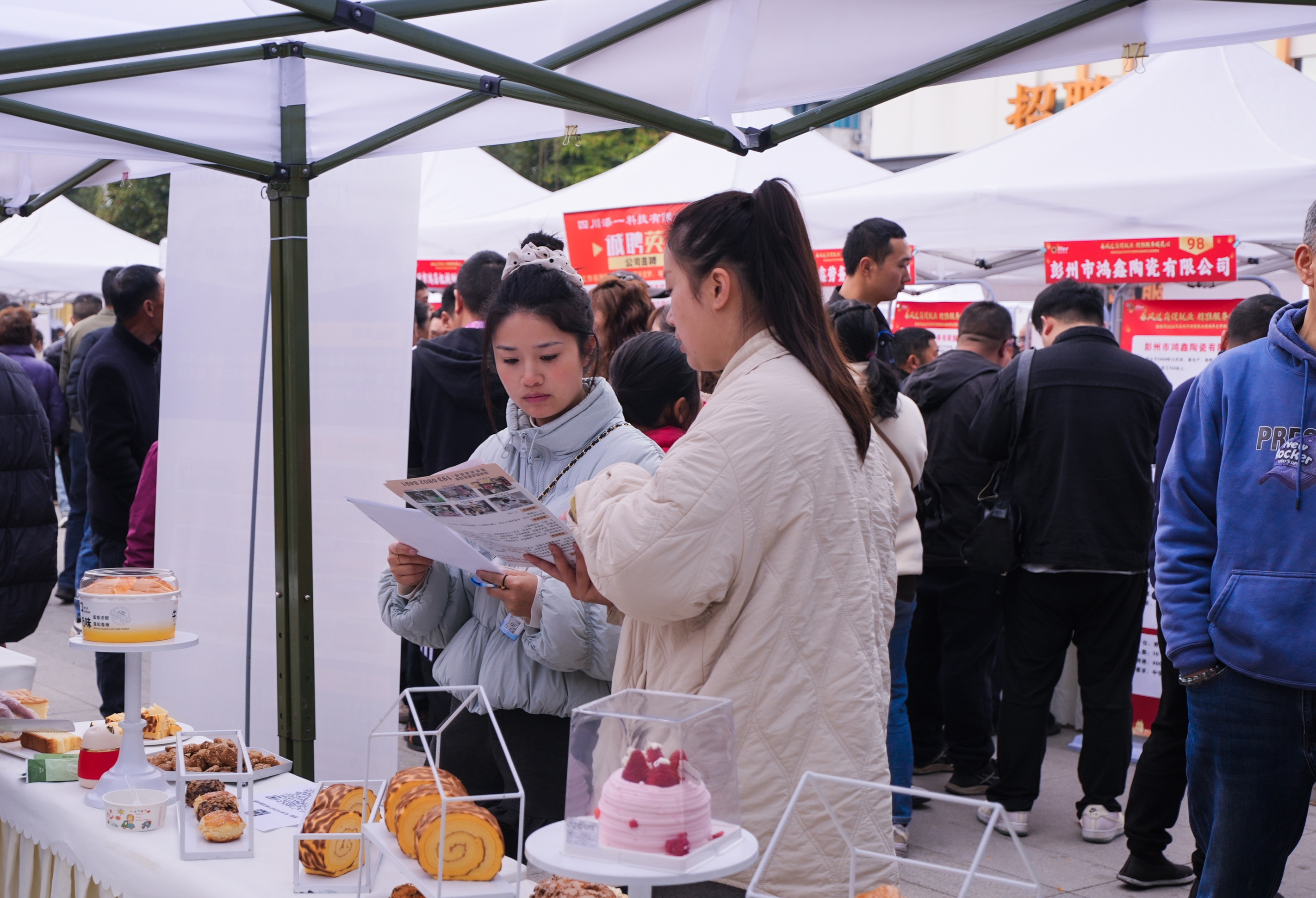 除了免费品尝的汤圆和非遗锅盔,这场招聘会处处洋溢着元宵节的温情。现场还设有免费义诊和本土企业特色产品集市。求职者在找工作的间隙,可以逛一逛“彭州造”好物,品一品家乡味道,甚至还能顺便量个血压、做个健康咨询。就业服务的“民生温度”在这一刻变得触手可及。