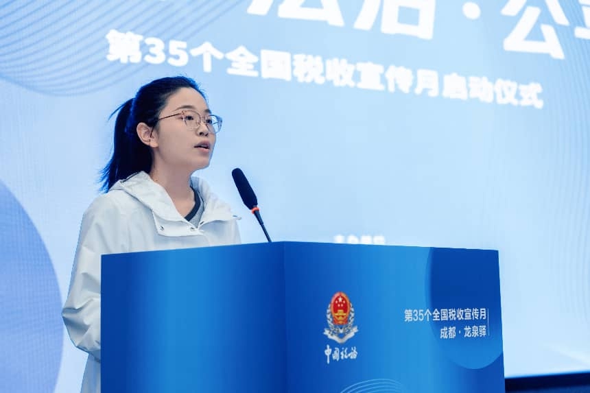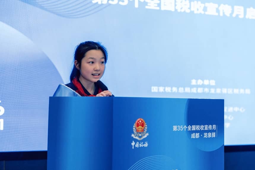 来自向阳桥中学的中学生代表用真挚的语言,分享了她对税收的理解。从校园到马路,从公园到图书馆,税收其实就藏在她生活的点点滴滴里,汇聚成幸福生活的底色。她向同龄人发出倡议,“税收护成长,少年勇担当”,希望和小伙伴们一起做税法知识的传播者、诚信纳税的守护者,让税收之花在少年心中绽放。
