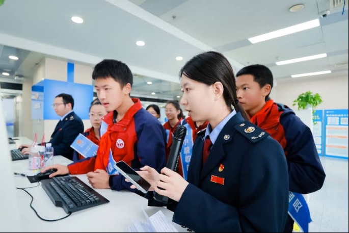 在办税服务厅,“小小税官”体验行活动正如火如荼地进行。税务干部带领中学生代表依次参观导税台、自助办税区、窗口服务区,了解办税服务厅功能分区,并亲身体验自助办税终端操作。孩子们通过观摩税务人员办理业务、尝试角色扮演等方式,在沉浸式体验中感悟税收“取之于民、用之于民”的道理。税务干部用通俗易懂的语言讲解税收如何建学校、修马路、护平安,在孩子心中播下依法纳税的种子,并通过青少年带动家庭增强法治观念。