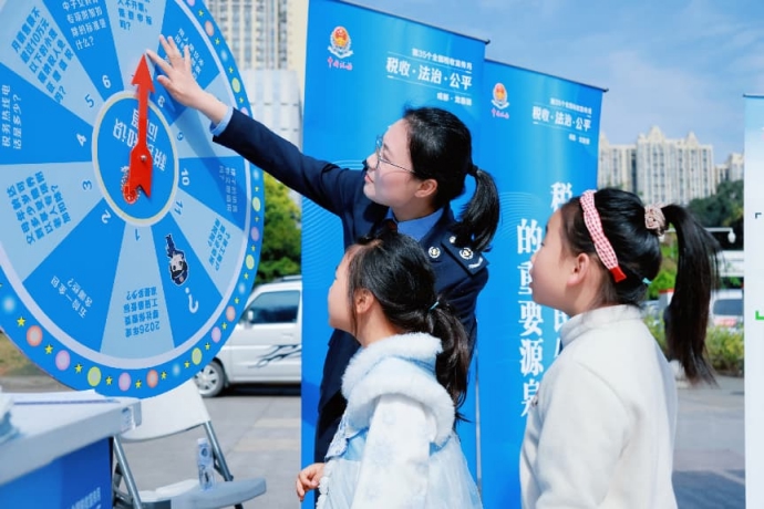 与此同时,龙泉驿区政务服务中心广场上的税费宣传展区也吸引了众多市民驻足参与。展区分设综合税政、社会保险费、非税收入、有奖发票四大专题板块,业务骨干现场提供政策咨询。中心互动区的大型有奖问答转盘成为现场人气焦点,市民转动转盘,回答税费相关问题,在轻松愉悦的氛围中学习政策。这种寓教于乐的宣传方式,让税法知识融入市民日常生活,推动法治意识在潜移默化中深入人心。