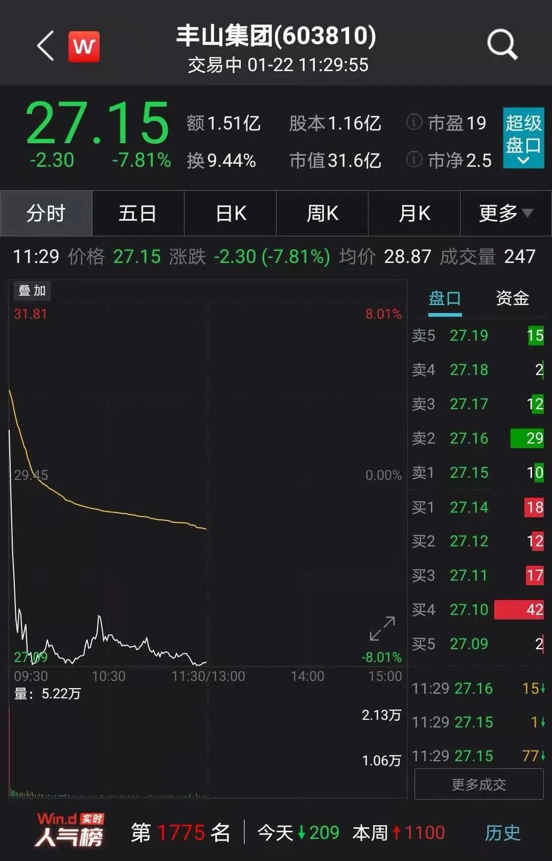 具体来看,丰山集团开盘价29.2元/股,到9:35,跌超6.5%,至午间收盘下跌7.81%,报27.15元/股。1月21日晚间,丰山集团发布公告称,公司董事、副总裁单永祥累计减持29.5万股,占公司现总股本0.254%,本次减持计划实施完毕。