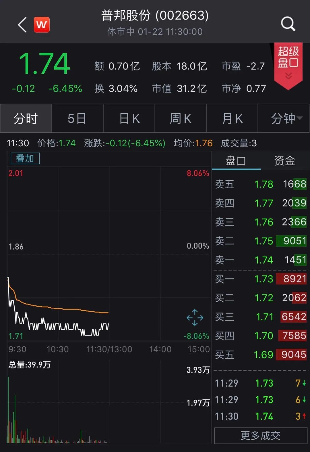 普邦股份开盘价1.81元/股,到9:35,跌近5%。至收盘下跌6.45%,报1.74元/股。