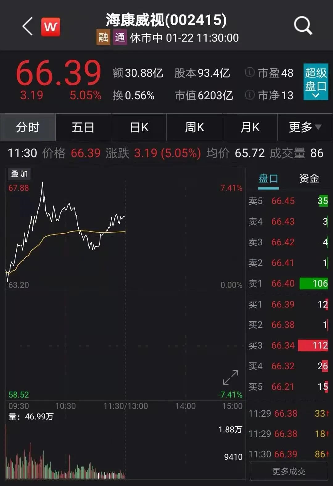 身为视频安防龙头企业,海康威视在1月22日开盘上涨,盘中市值突破6000亿元,至上午收盘上涨5.05%创历史新高,总市值为6203亿元,半日成交额为30.88亿元,换手率为0.56%。