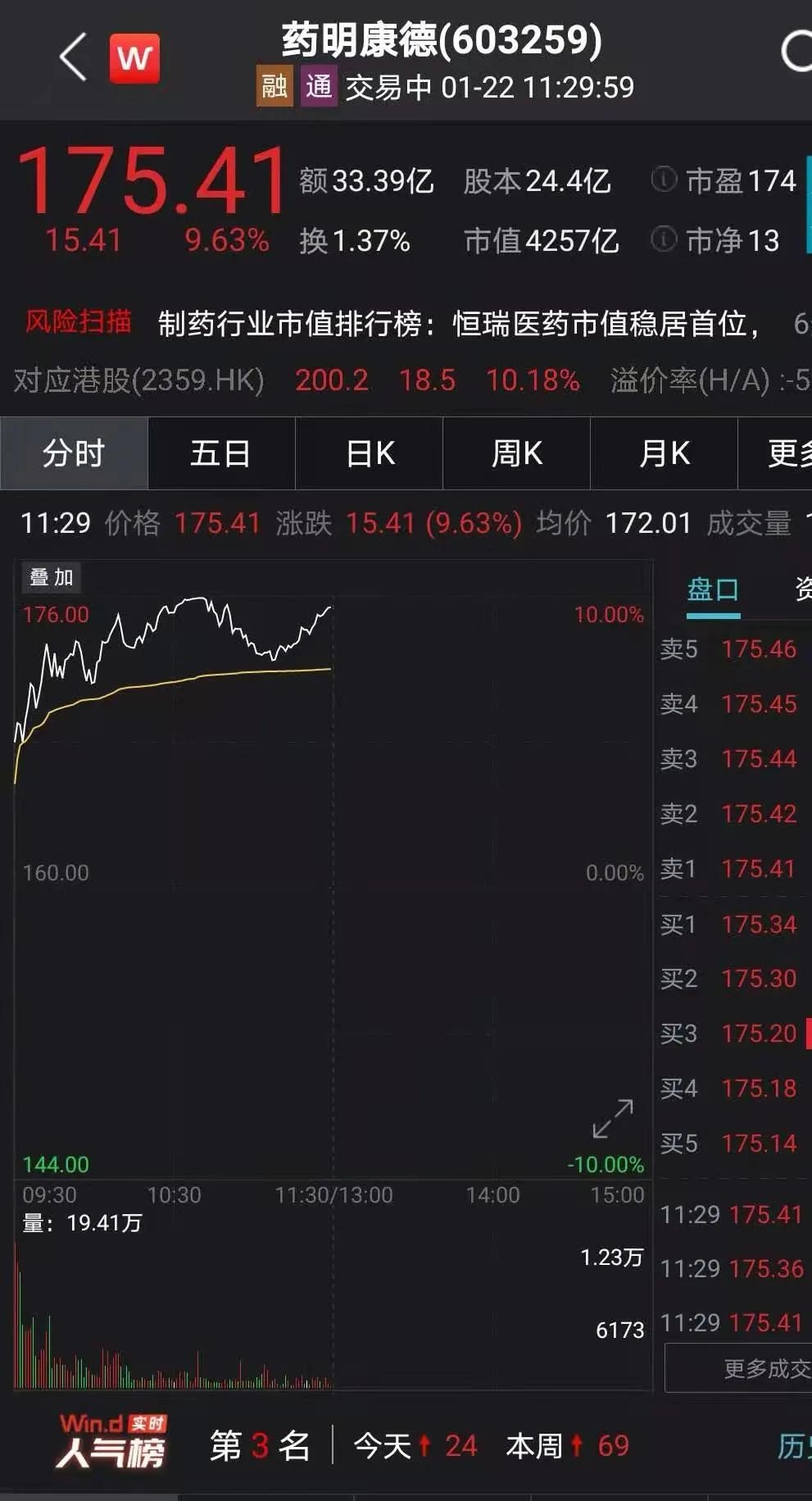 医药龙头股药明康德早盘高开高走,盘中一度触及涨停,至收盘上涨9.63%,市值达4257亿元。该公司前一日发布公告称,预计2020年年度实现归属于公司股东的净利润与2019年年度的185455.09万元相比,增加92727.55万元到111273.06万元,同比增长50%到60%。