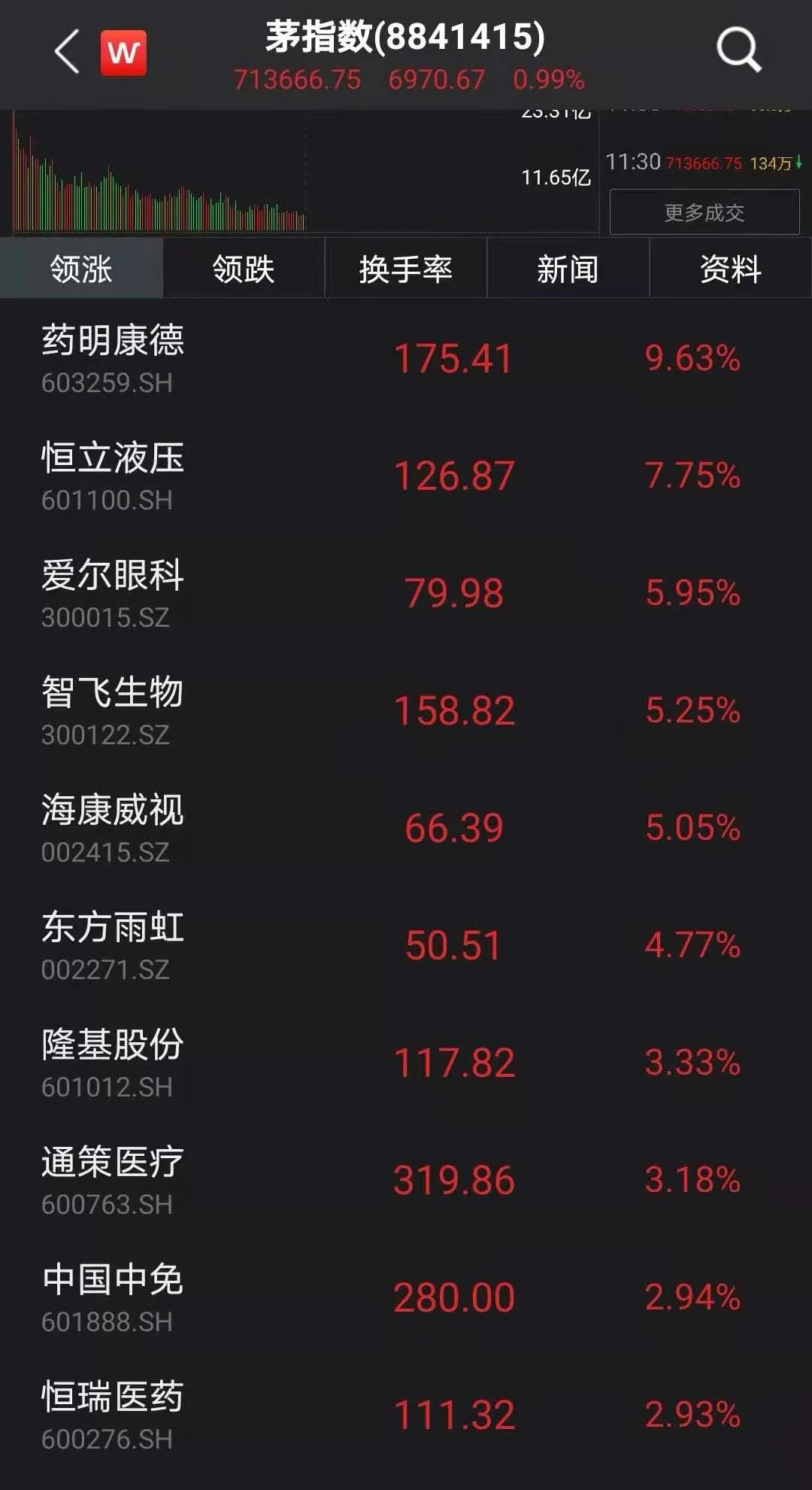 Wind数据显示,贵州茅台半日上涨0.82%,Wind茅指数上涨0.99%,除了上述两只龙头股,恒立液压、隆基股份、爱尔眼科、东方雨虹、智飞生物等也涨幅居前。