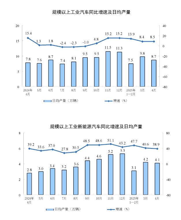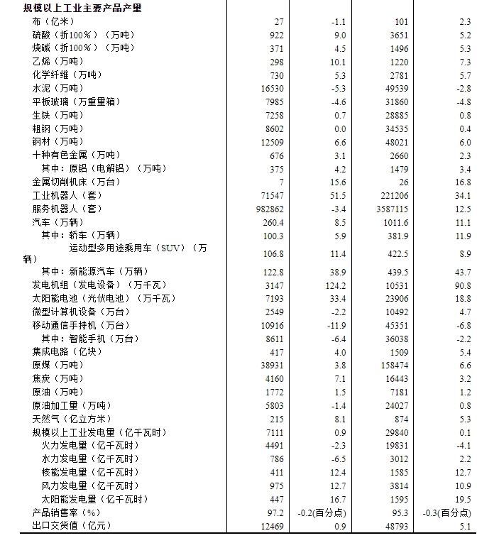 分产品看,4月份,规模以上工业623种产品中有341种产品产量同比增长。其中,钢材12509万吨,同比增长6.6%;水泥16530万吨,下降5.3%;十种有色金属676万吨,增长3.1%;乙烯298万吨,增长10.1%;汽车260.4万辆,增长8.5%,其中新能源汽车122.8万辆,增长38.9%;发电量7111亿千瓦时,增长0.9%;原油加工量5803万吨,下降1.4%。