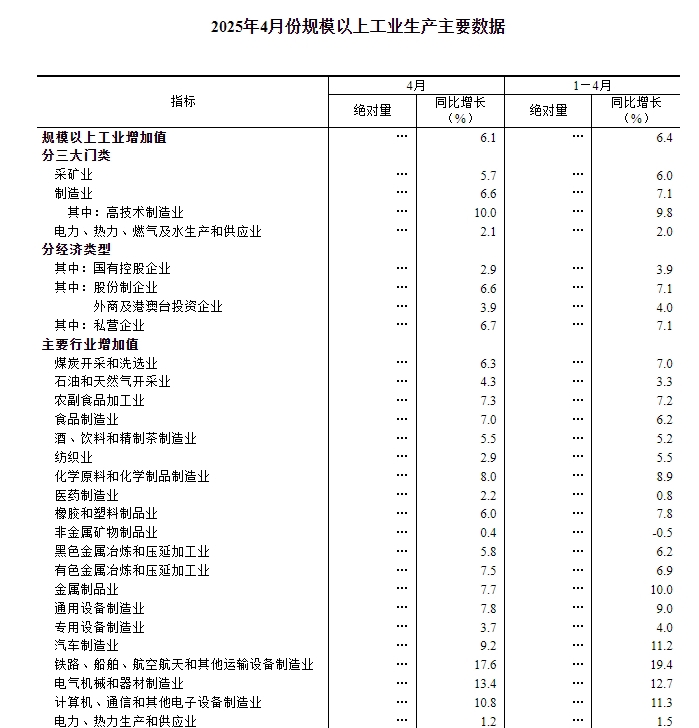 国家统计局:4月份全国规模以上工业增加值同比增长6.1%